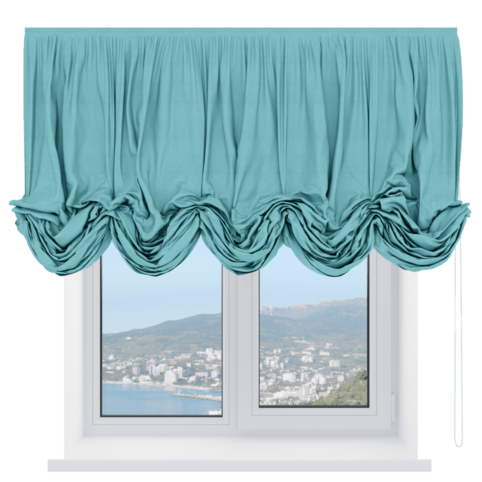 Австрийская штора лён кашемир голубой, карниз верёвочный